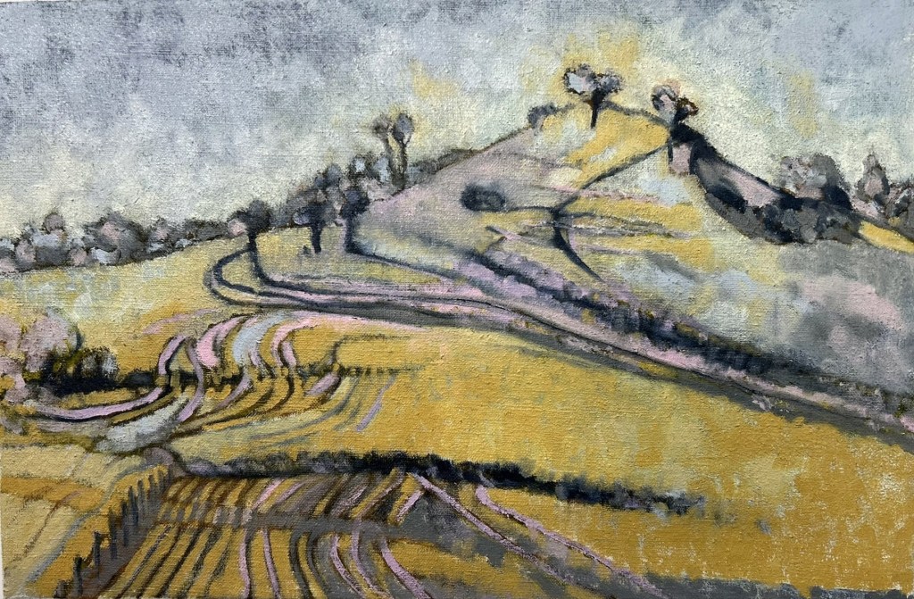 “This work is taken from 2023, a day painting at Katrine, outside Toodyay, WA. Behind the farm stay a hill of golden wheat was being harvested over the days, imprinting the landscape with lines. A November sun blurred the vision by day but at dusk the mauves combined with a softer yellow. I wanted to work in a freer fashion after again working with stencils on the project before. This work focused on colour, line and texture as I tried a new paint thickener.